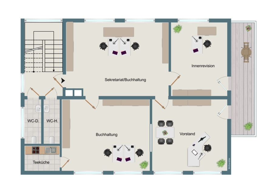 Die Aufteilung umfasst 4 Büroräume, eine kleine Teeküche, Sanitäranlagen sowie einen Balkon. Je nach Wunsch kann die Übergabe möbliert oder geräumt erfolgen. Darüber hinaus sind Umbau- und Anpassungsmaßnahmen nach Absprache möglich, sodass sich die Fläche optimal an individuelle Anforderungen anpassen lässt.