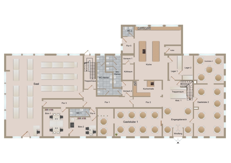 Als ,,Heide Landhaus Döhle '' zuletzt betrieben, befindet sich im Erdgeschoss ein Gastronomiebetrieb, mehre Gästeräume, die Küche mit Kühlraum, zwei Büros, sowie Kundentoiletten für Damen und Herren. Mit eigenem Eingang versehen befindet sich hier weiterhin ein typischer Festsaal. In den Gästeräumen sorgen aufgearbeitete Dielen, restaurierte Wandmalereien und ein Kamin für den klassischen Heide-Look.