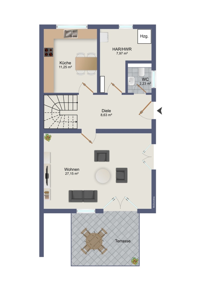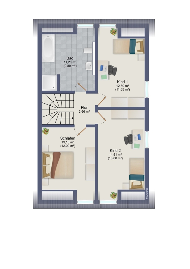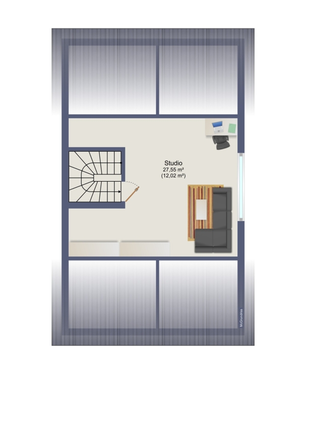 Die Grundfläche beträgt 142,60 m². Die Schrägen abgezogen beläuft sich die Wohnfläche auf 119,22 m² (inkl. Spitzboden mit 27,55 m² - Wohnflächenverordnung mit 12.02 m²).