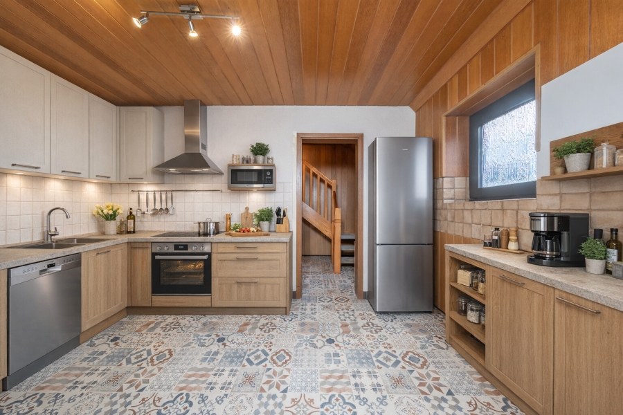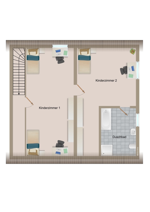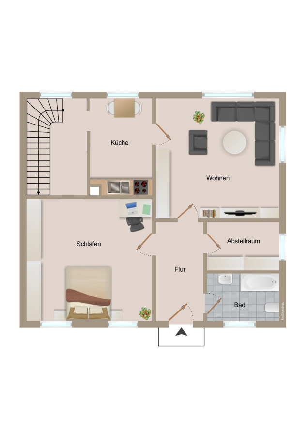 Im Erdgeschoss befinden sich Küche, Wohnzimmer, Schlafzimmer, ein Abstellraum sowie ein Wannenbad. Das Dachgeschoss umfasst zwei Kinderzimmer und ein Duschbad. Eine Holztreppe verbindet die Etagen.