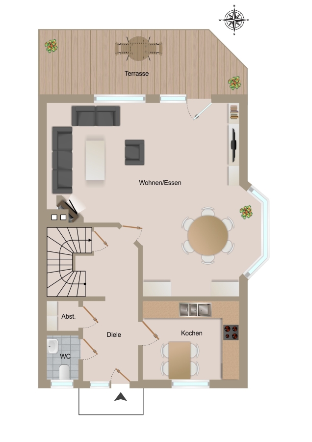 Im Erdgeschoss erwartet Sie eine chamante Wohnebene mit allem, was man braucht. Das Erdgeschoss hat ein großes Wohnzimmer, indem Platz für ein Esstisch, ein Sofa sowie vieles mehr ist. Außerdem bietet die Einbauküche genügend Platz und Arbeitsflächen, um entspannt die Mahlzeiten zuzubereiten. Auch ein Gäste-WC ist im Erdgeschoss vorhanden, sodass es einem an nichts fehlt.