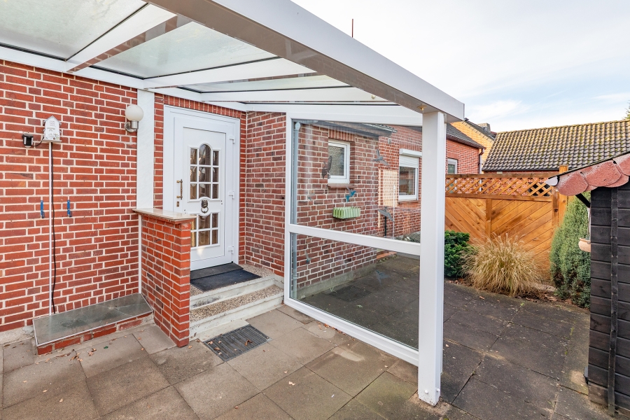 Das Grundstück ist im vorderen Bereich durch mehrere Anbauten geprägt. An die Garage angeschlossen befindet sich ein zusätzlicher Raum mit eigenem Badezimmer, der sich ideal als Gästezimmer oder Hobbyraum eignet. Ergänzt wird das Angebot durch eine Art Wintergarten sowie einer kleinen Werkstatt.