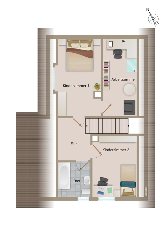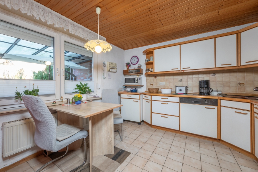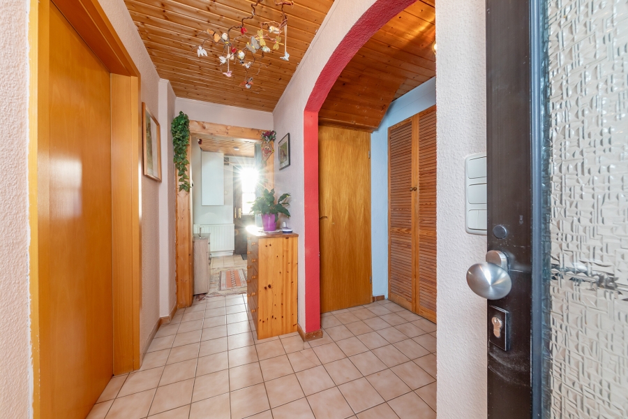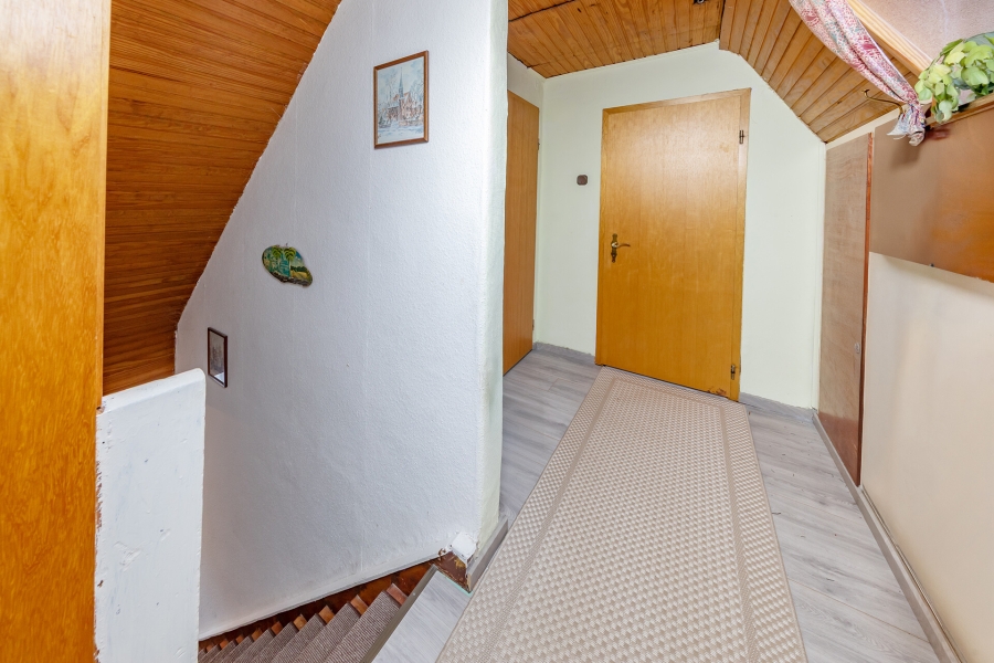 Im Erdgeschoss befinden sich zwei Zimmer, ein Duschbad, die Küche sowie praktische Einbauschränke. Alle Räume sind mit Rollläden ausgestattet. Über eine charmante Holztreppe gelangt man in das Dachgeschoss, das drei weitere Zimmer und ein Wannenbad umfasst.