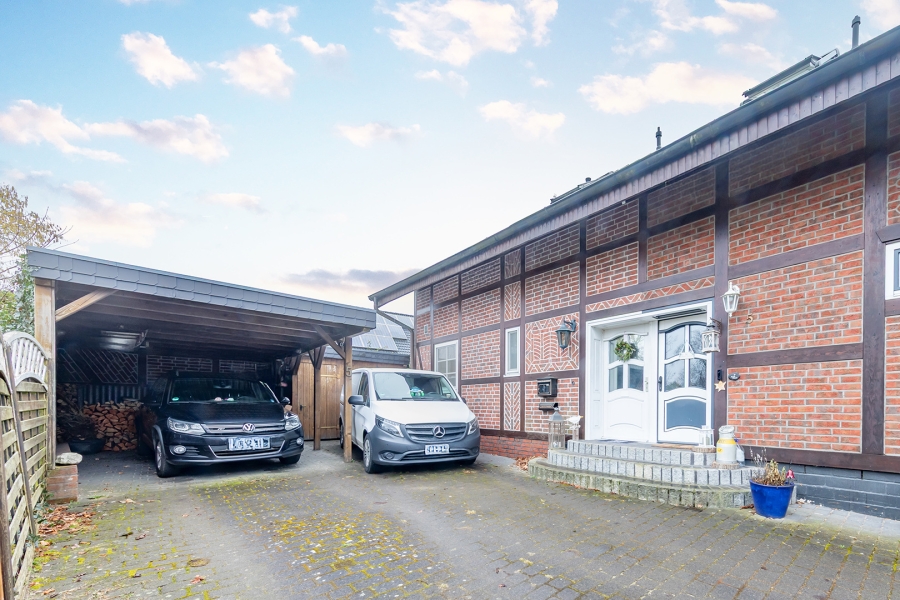Im Außenbereich erwartet Sie eine großzügige Terrasse, die zum Entspannen und geselligen Abenden einlädt. Ein praktischer Abstellraum bietet zusätzlichen Stauraum, während das Carport für einen geschützten Stellplatz sorgt.