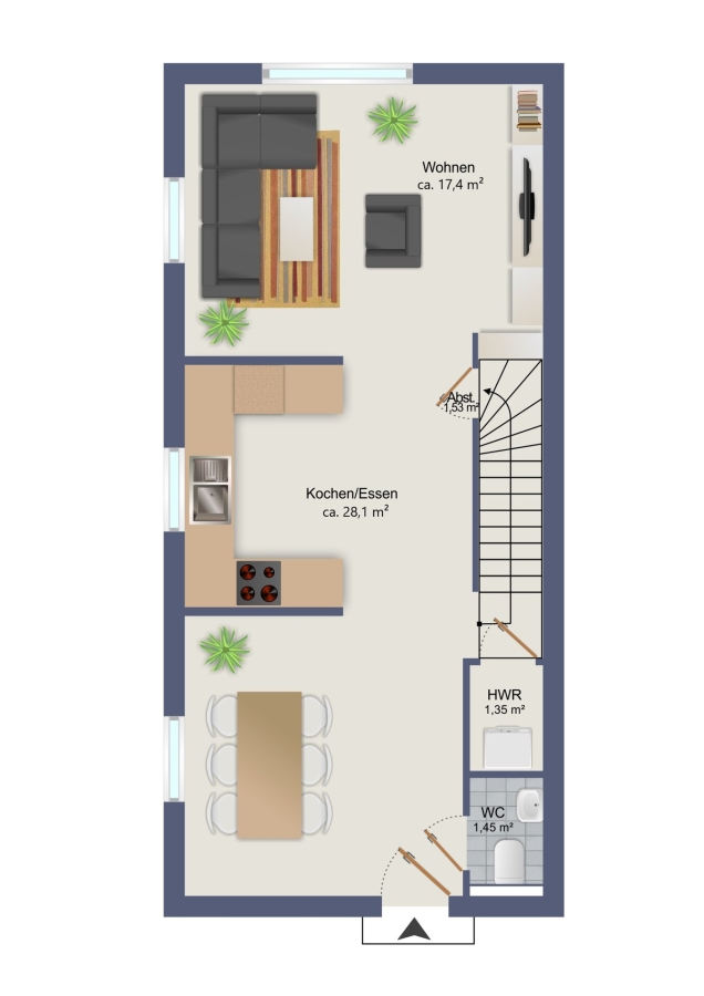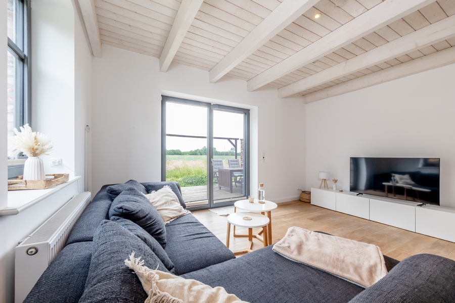 Das Herzstück des Hauses bildet der großzügige Wohn- und Essbereich mit einer offenen Einbauküche im Loftstil. Die sichtbare Balkenlage verleiht dem Raum einen besonderen Charme und unterstreicht den modernen Charakter des Hauses. Große Fensterflächen sorgen für viel Tageslicht und schaffen ein helles, freundliches Wohnambiente. Vom lichtdurchfluteten Wohnzimmer aus gelangen Sie direkt auf die Terrasse und in den Garten.