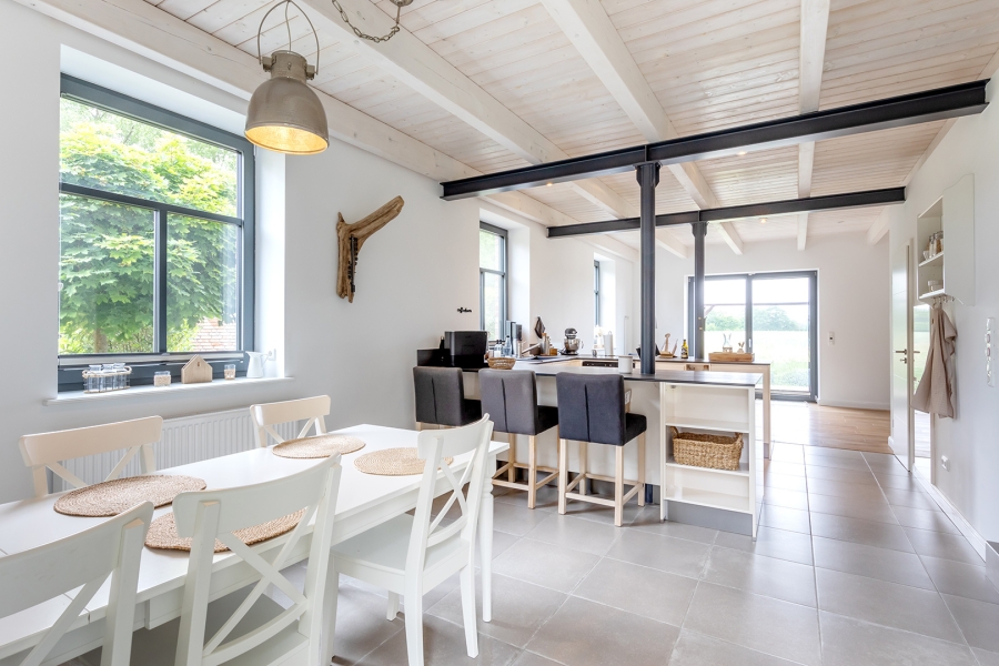 - Offene Einbauküche mit Balkenlage im Loftstil