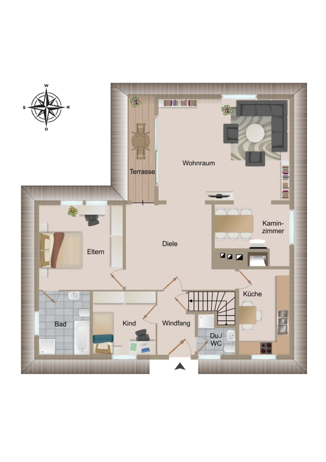 Das Haus verfügt über ein Elternschlafzimmer mit direktem Zugang zum Vollbad. Darüber hinaus stehen ein weiteres Schlafzimmer sowie ein separates Gäste-WC zur Verfügung. Der großzügige Wohnbereich mit direktem Zugang zur Terrasse und zum gemütlichen Kaminzimmer lädt zum Entspannen ein. Ergänzt wird das Raumangebot durch eine separate Küche.