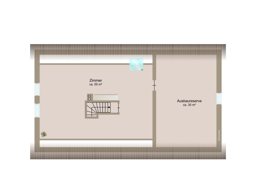 Im Dachgeschoss ist bereits der größte Teil (ca. 55 m²) zu einem wohnlichen Zimmer ausgebaut worden. Weiter sind ca. 30 m² als Ausbaureserve vorhanden.