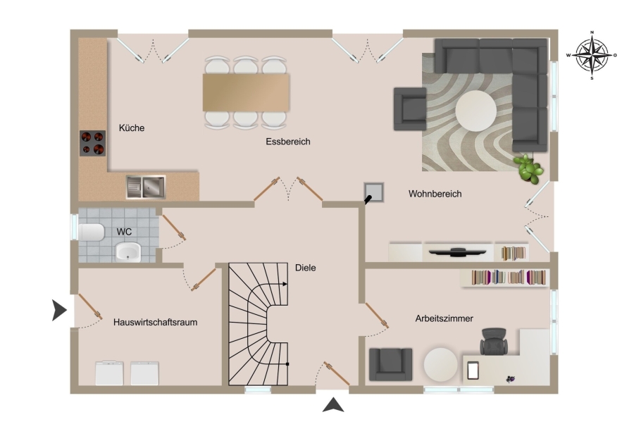Hauswirtschaftsraum und ein Gäste-/Arbeitszimmer runden das Raumangebot im Erdgeschoss