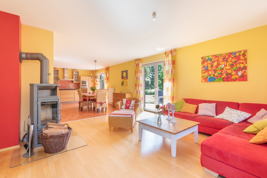 große Fensterflächen und einen gemütlichen Kaminofen zum Mittelpunkt des Hauses wird. Hier