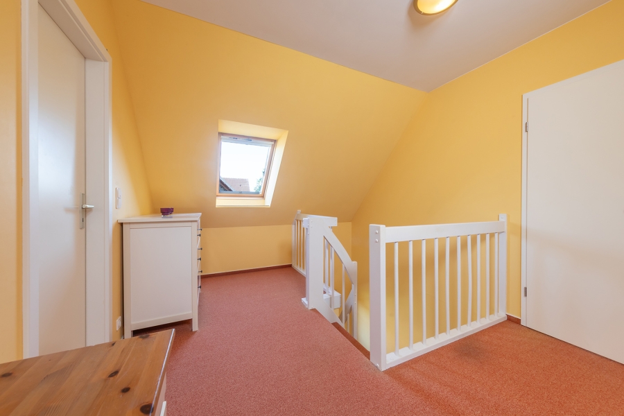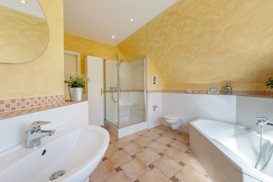 Das Obergeschoss bietet drei Schlafzimmer sowie ein großzügiges Vollbad, das mit Badewanne