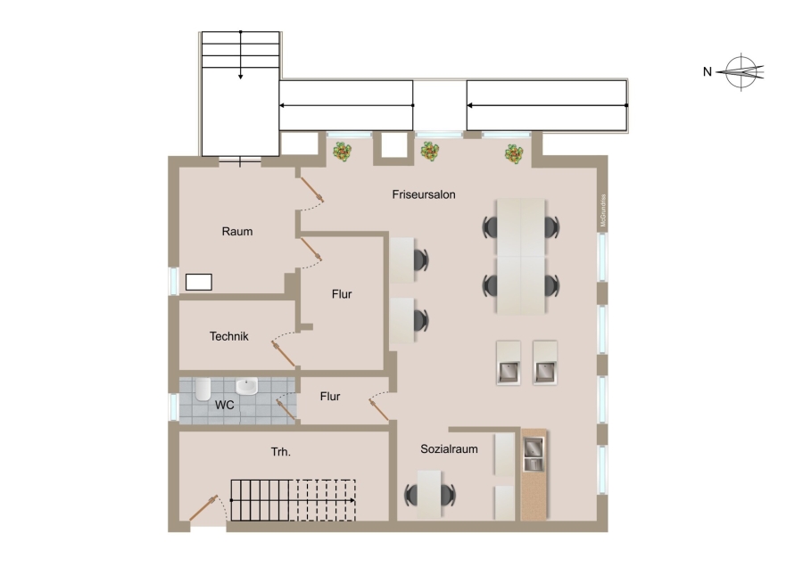 Das Mehrfamilienhaus steht auf einem ca. 646 m² großen Grundstück und umfasst insgesamt drei Einheiten. Im Erdgeschoss befindet sich ein 60 m² großer Friseurladen, der seit 2019 für monatlich € 521,22,- kalt vermietet ist. Die Gewerbeeinheit verfügt über ein WC, eine Küche sowie einen großzügigen Friseurbereich. Zur Straßenseite sind Holzfenster verbaut, im übrigen Bereich Kunststofffenster. Auf der Südseite sind vor den Fenstern Lamellen als Sicht- und Sonnenschutz angebracht. Fünf PKW-Stellplätze stehen zur Verfügung.
