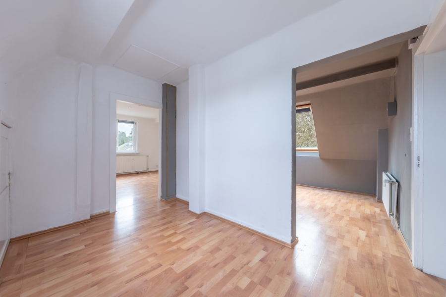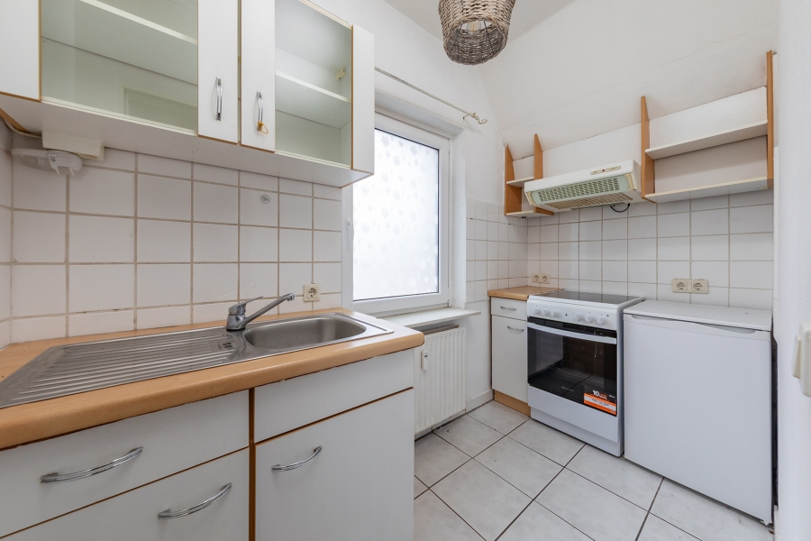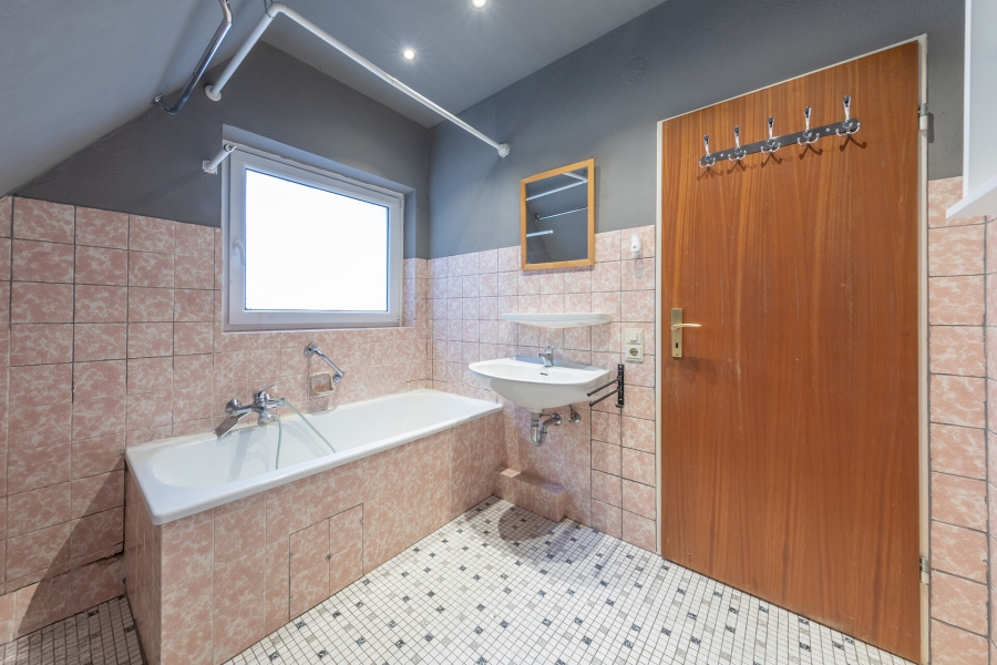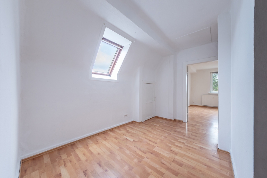 Die Dachgeschosswohnung ist seit 2019 vermietet (640 €) und bietet 3 Zimmer auf ca. 63 m², eine offene Küche, Balkon, Laminat, Kunststofffenster, Wannenbad und Abstellraum.