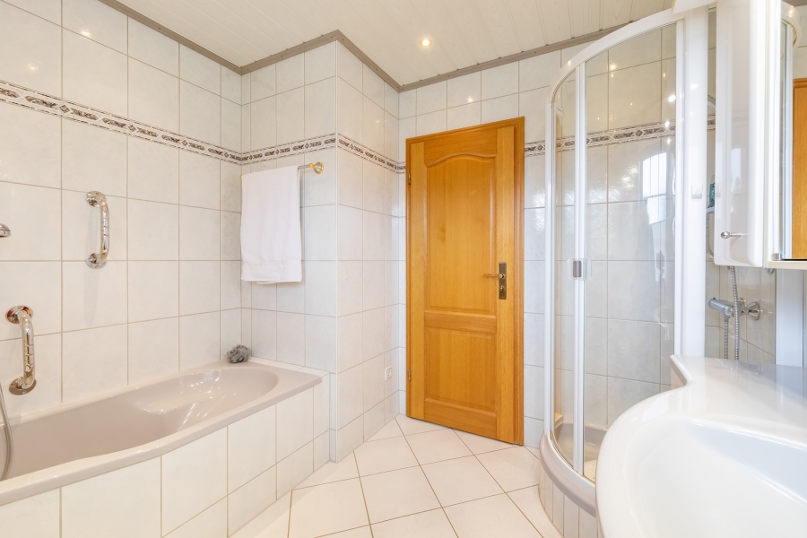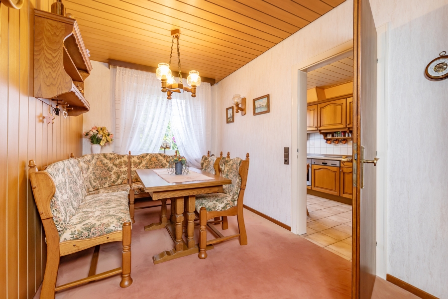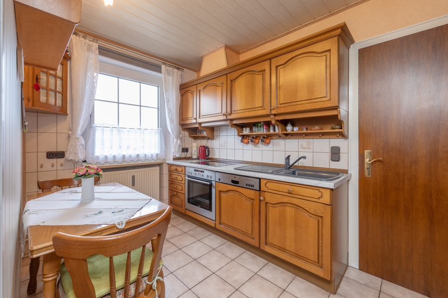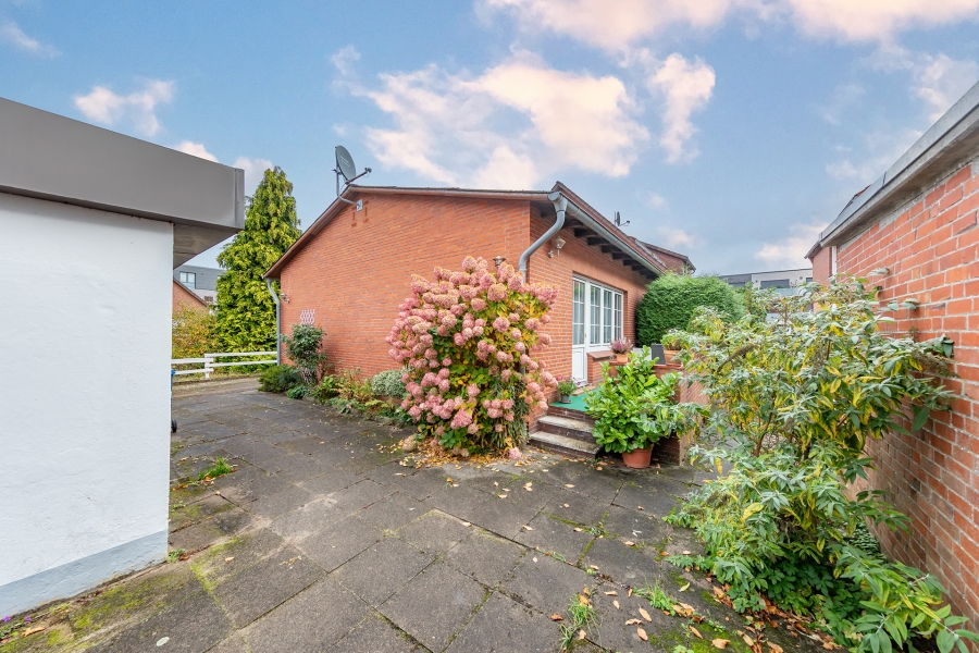 Der Anbau hat einen eigenen Eingang und beherbergt eine Wohnung mit drei Zimmern, einer Küche und einem Vollbad.