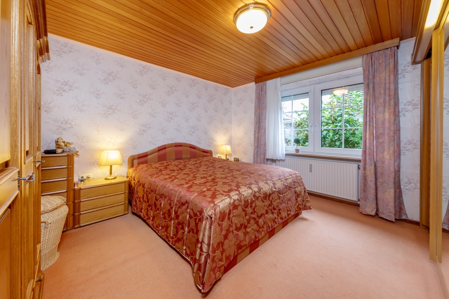 Im Erdgeschoss befinden sich zwei gut geschnittene Wohnungen. Die südliche Wohnung verfügt über zwei Zimmer, eine Küche, ein Duschbad und eine private Terrasse, erreichbar über einen separaten Eingang. Die nördliche Wohnung bietet ebenfalls zwei Zimmer, eine Küche und ein Duschbad und ist über den vorderen Eingang zugänglich. Beide Erdgeschosswohnungen sind durch einen gemeinsamen Flur verbunden, über den die Dachgeschosswohnung zu erreichen ist.
