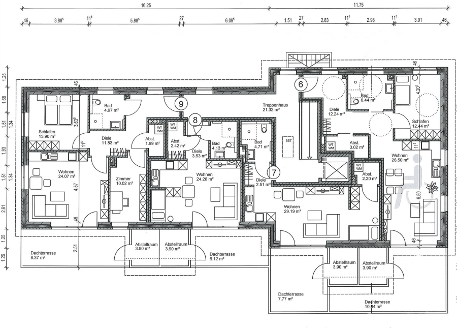 Dank flach geneigter Walmdächer können auch die Wohnungen im Dachgeschoss ohne Dachschrägen optimal genutzt werden.