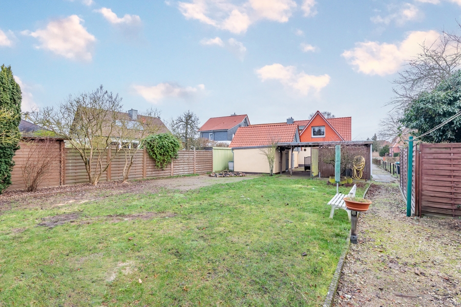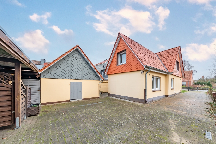 Im rückwärtigen Bereich befindet sich ein gepflasterter Hof mit Stellplätzen für Pkw sowie ein Carport. Ein besonderes Highlight ist der großzügige Garten, aus dem sich bei Bedarf ein potenzieller Bauplatz abtrennen lässt.