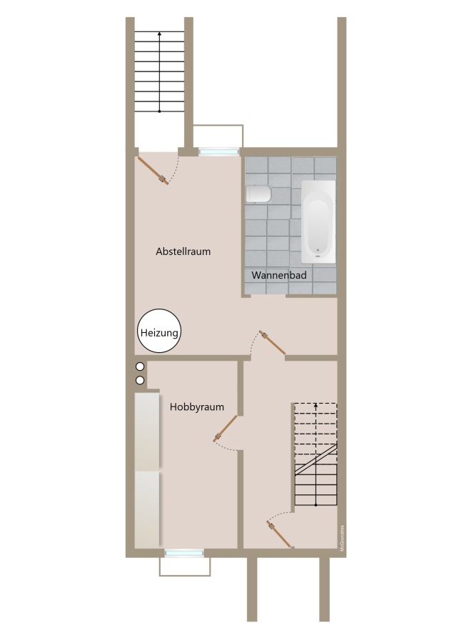 Der Vollkeller ist sowohl vom Flur als auch vom Garten erreichbar. Hier finden Sie den Heizungsraum und drei weitere Räume, wovon einer ein vorbereitetes Wannenbad ist. Die restlichen Räume können beispielsweise als Werkstatt oder Lagerräume genutzt werden.