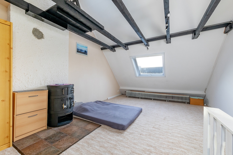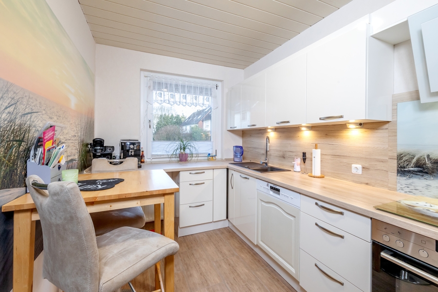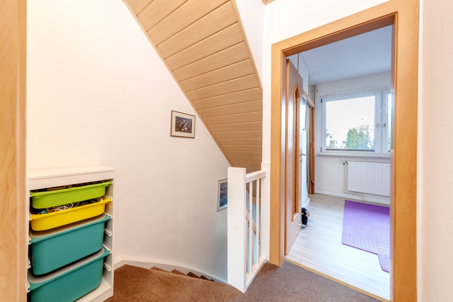 Die Küche ist in heller Holzoptik zeitlos gehalten und bietet genügend Platz für einen Küchentisch. Im Obergeschoss gibt es zwei Schlafzimmer sowie ein zeitgemäßes Duschbad. Ein weiteres Zimmer im Dachgeschoss wurde wohnlich ausgebaut.