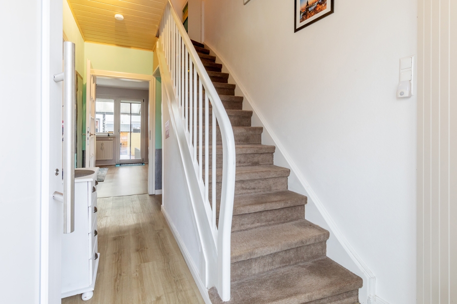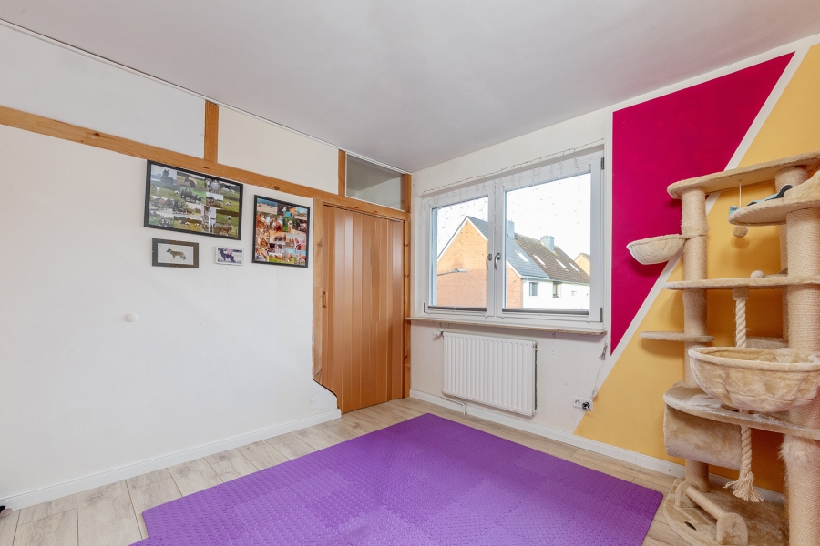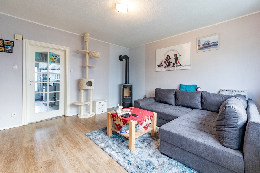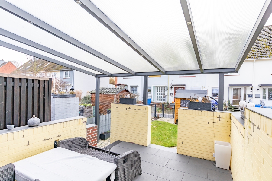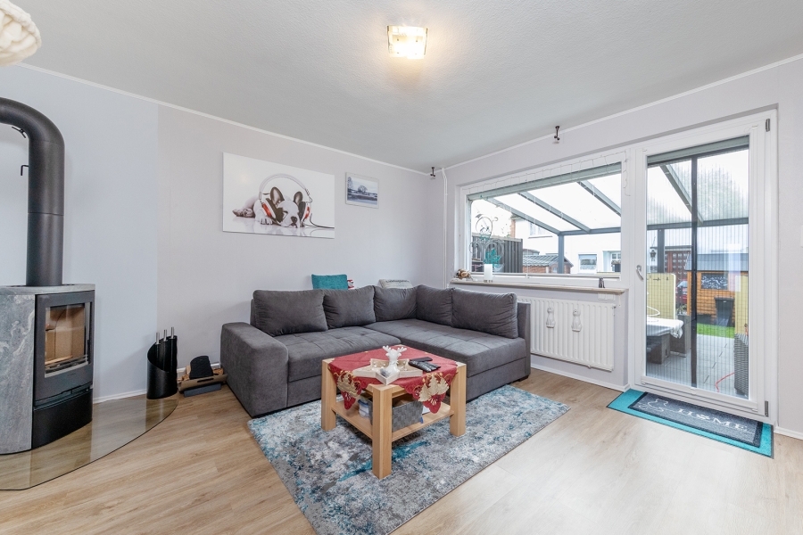 Eine große Fensterfront im Wohnzimmer, spendet viel Licht und bietet einen Zugang zur überdachten Terrasse. Tageslicht gelangt zudem durch die große Haustür in den Flur. In einer kleinen Nische im Flur haben Sie einen tollen Einbauschrank mit viel Stauraum.