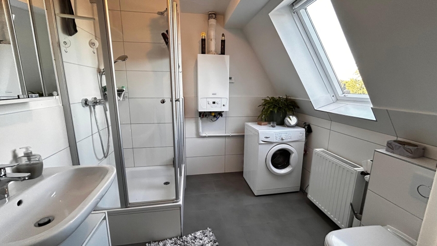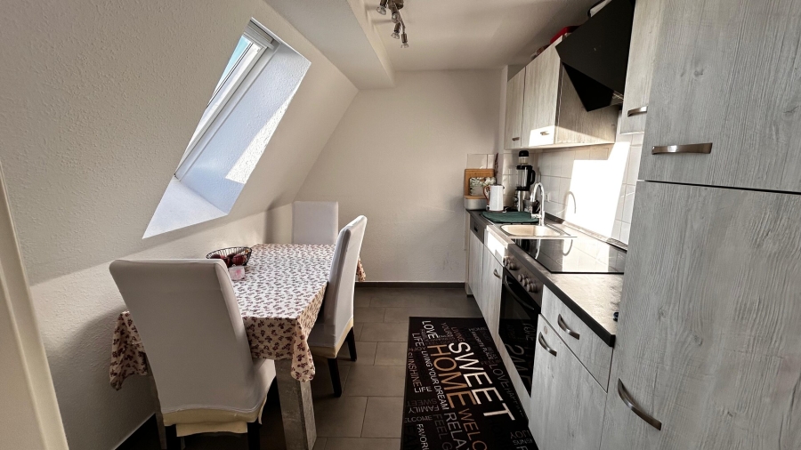 Das Dachgeschoss wurde nachträglich ausgebaut und bietet eine charmante 2-Zimmer-Wohnung über die gesamte Fläche. Für eine Dachgeschosswohnung sind wenig Dachschrägen vorhanden, dass genügen Platz zum stellen von Schränken vorhanden ist. Zudem bietet die Wohnung einen Abstellraum, eine Abseite und eine Garderobe.