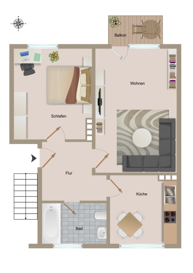 Die Wohnung vermittelt ein warmes und einladendes Ambiente. Das Wohnzimmer sowie das Schlafzimmer sind lichtdurchflutet dank der bodentiefen Balkontür und den großen Fenstern. Von dem Balkon haben Sie einen herrlichen Blick über den grünen Garten. Der Balkon ist nach Westen ausgerichtet.