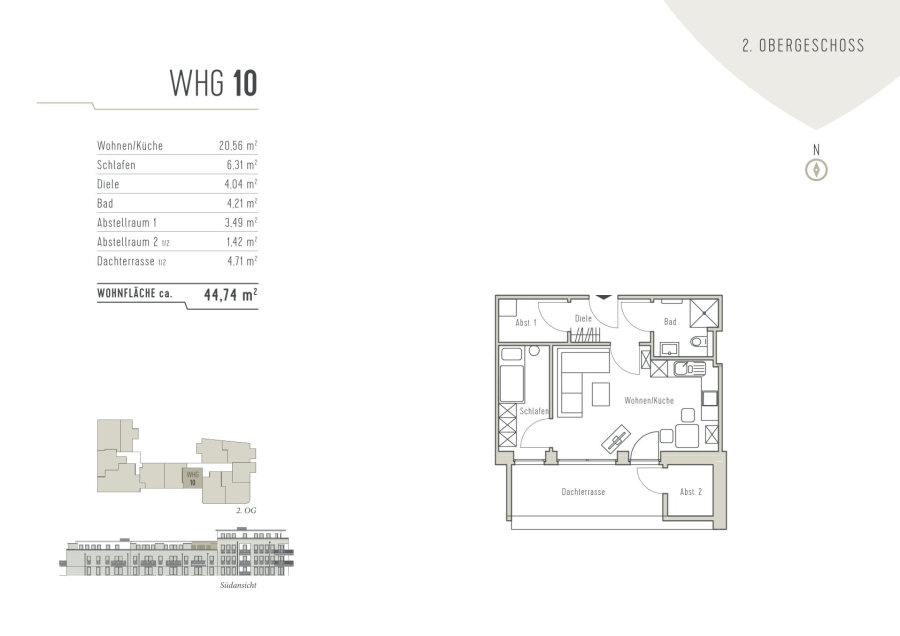 Auf ca. 45 m² erwarten Sie zwei Zimmer: ein gemütliches Schlafzimmer sowie ein heller Wohn- und Essbereich mit offener, moderner Küche. Ein praktischer Abstellraum mit Waschmaschinenanschluss ergänzt die Wohnung. Zusätzlich steht Ihnen auf der Dachterrasse ein separater Vorratsraum zur Verfügung – ideal zur Aufbewahrung von Haushaltsgegenständen oder kleineren Möbeln.