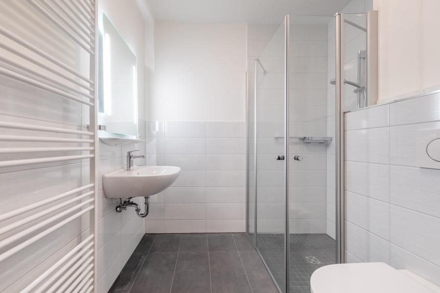 Das moderne Duschbad ist barrierearm gestaltet und verfügt über eine ebenerdige Dusche, sodass es höchsten Komfort bietet.
