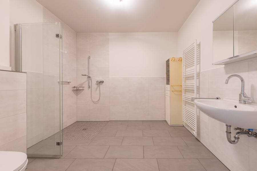 Das moderne Duschbad ist barrierearm gestaltet und verfügt über eine ebenerdige Dusche, sodass es höchsten Komfort bietet.