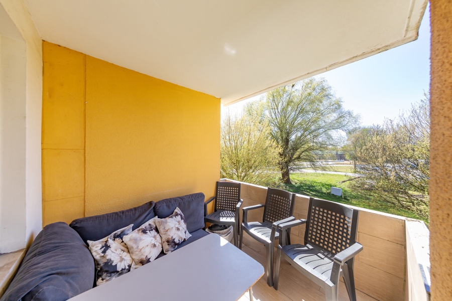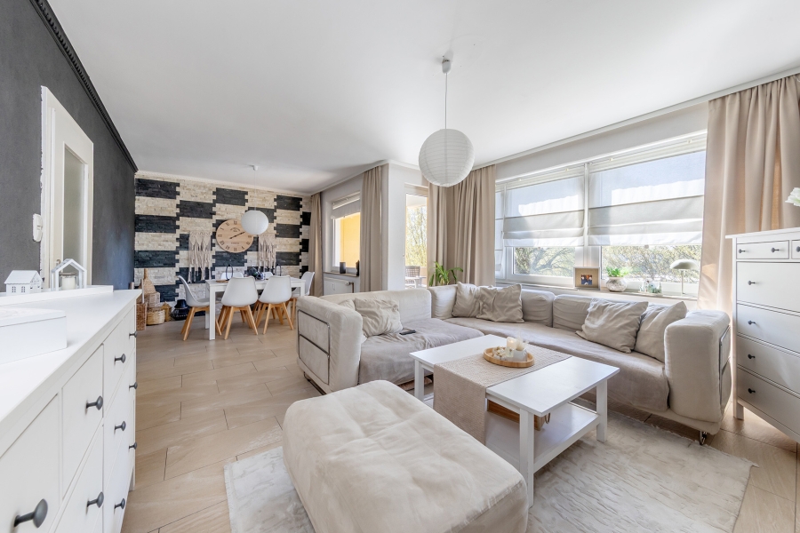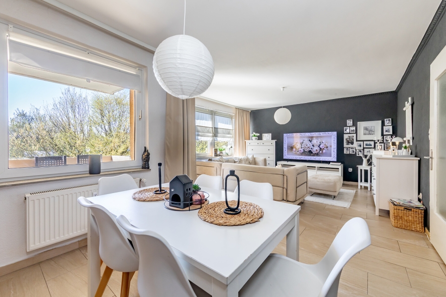 Das helle Wohnzimmer mit direktem Zugang zum Balkon bildet den Mittelpunkt der Wohnung und lädt zum Entspannen ein. Die gepflegte Küche bietet ausreichend Platz zum Kochen und Verweilen.