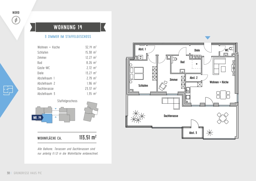 Der großzügige Wohn- und Essbereich bietet direkten Zugang zur großen Dachterrasse. Zwei gut geschnittene Schlafzimmer, eine geräumige Diele sowie ein modernes, ebenerdiges Badezimmer mit Walk-in-Dusche sorgen für hohen Wohnkomfort. Ergänzt wird das Raumangebot durch ein separates Gäste-WC sowie einen praktischen Abstell- bzw. Hauswirtschaftsraum mit Waschmaschinenanschluss. Zur Wohnung gehört außerdem ein Tiefgaragenstellplatz. Eine Einbauküche ist vorhanden.