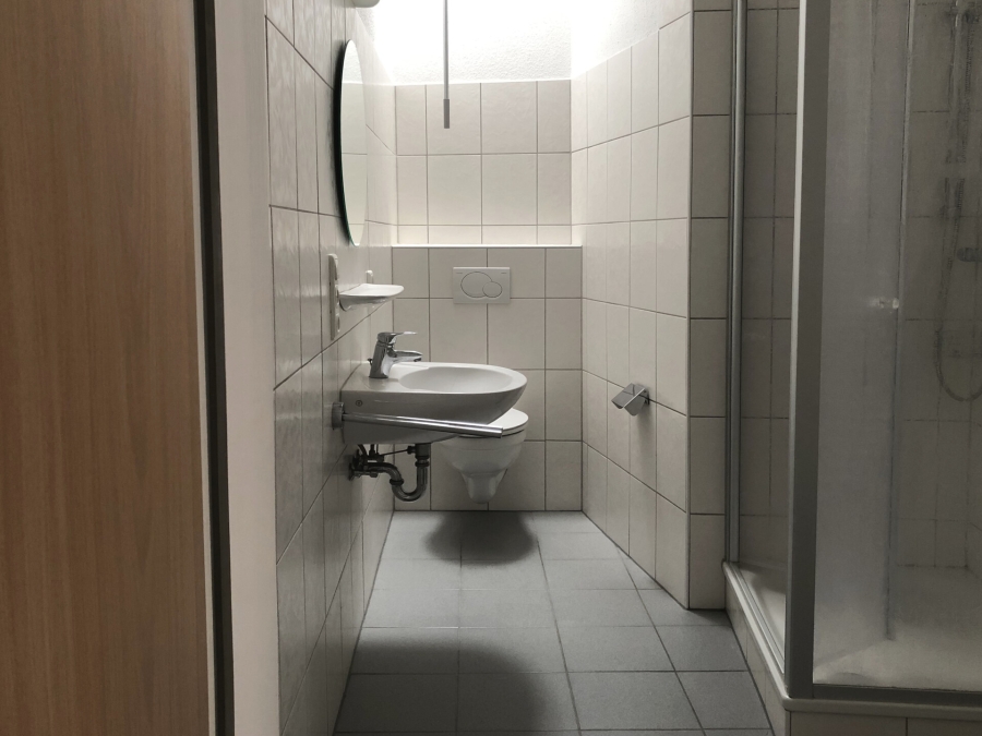 Das helle Tageslichtbad ist mit einer Dusche ausgestattet und verfügt über einen Anschluss für eine Waschmaschine. Zwei praktische Abstellräume innerhalb der Wohnung bieten zusätzlichen Stauraum. Für Fahrräder steht ein gemeinschaftlich genutzter Fahrradschuppen zur Verfügung. Der Fernsehempfang erfolgt über einen Kabelanschluss.