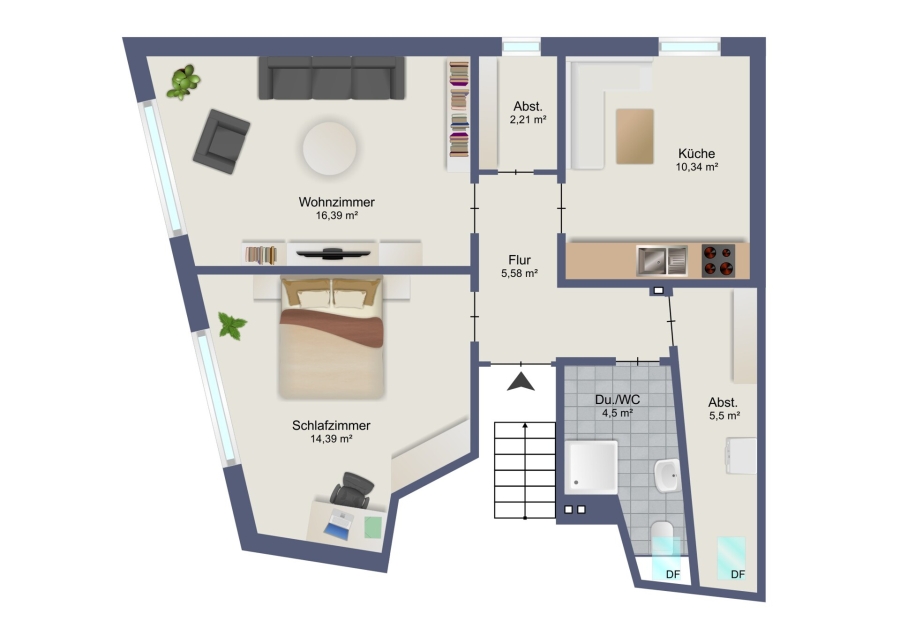 Die Wohnung überzeugt durch eine durchdachte Raumaufteilung mit zwei gut geschnittenen Zimmern, die individuell genutzt werden können – ob als Wohn- und Schlafzimmer, Homeoffice oder Gästezimmer. Die Küche bietet viel Platz für eine gemütliche Essecke und lädt zum Kochen und Verweilen ein. Eine Einbauküche ist nicht vorhanden.