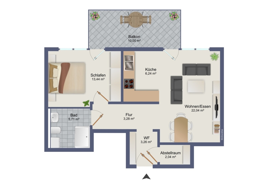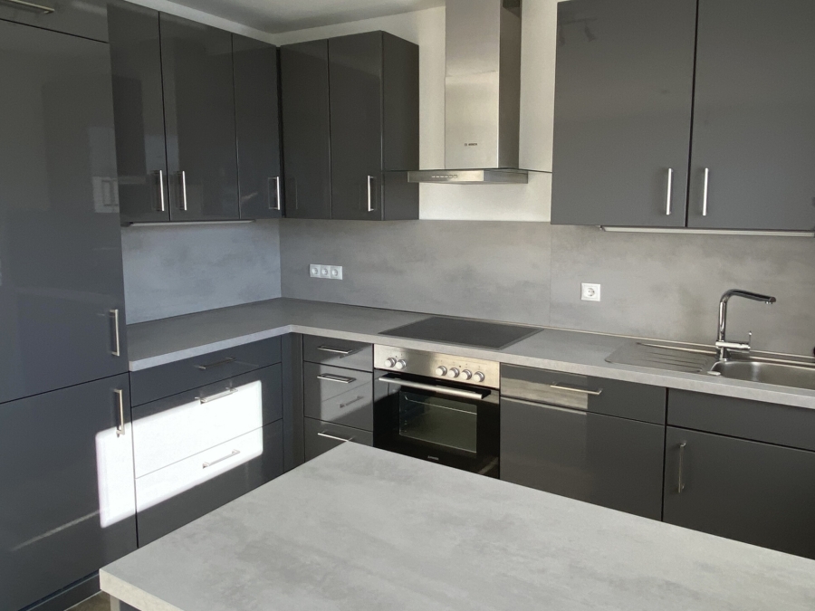 Die Wohnung verfügt über eine moderne Küche in grauer Hochglanzoptik mit Kühl- und Gefrierschrank und einer Spülmaschine. Sie haben einen offenen Wohn- und Essbereich mit Zugang zum großzügigen Balkon. Das Schlafzimmer hat ebenfalls einen Zugang zum Balkon. Im Badezimmer haben Sie eine große Dusche sowie einen Waschmaschinenanschluss. Ein Abstellraum bietet genügend Staufläche für Vorräte, Staubsauger, etc.